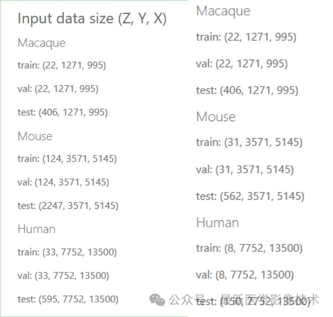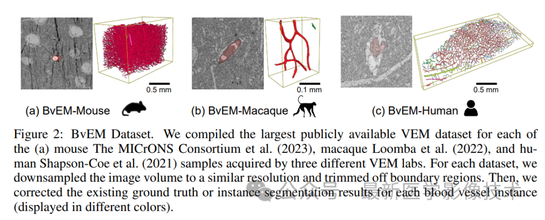 BvEM数据集来自三种猿类动物的样本:成年小鼠的视觉皮层,成年猕猴,以及成年人类。每个数据集都是在不同的VEM设施中使用不同的协议获得的。BvEM-Macaque 数据具有大约 0.5G 体素,BvEM-Mouse 和 BvEM-Human 图像数据大约比它大 80 倍和 121 倍。