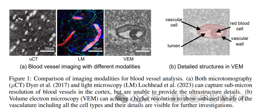 大脑约占体重的 2%,接受约 20% 的血液供应。由于血液供应不足,例如中风,患者平均会损失约 190 万个神经元。在许多脑部疾病中都观察到血管结构的改变,例如阿尔茨海默病和血管性痴呆。因此,通过具有不同分辨率和结构细节的各种成像方法对大脑中的血管进行了广泛的研究(图1a)。与宏观水平成像(例如 CT 和 MRI)和中尺度成像(光学显微镜)相比,体电子显微镜(VEM)可以揭示包括内皮细胞、神经胶质细胞和神经元在内的详细超微结构(图 1b)。