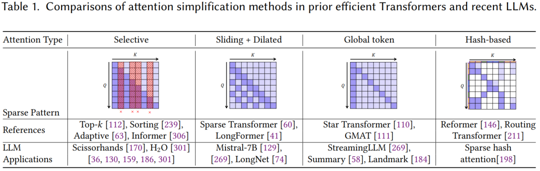 配置缩小:直接缩小模型配置。 注意力简化:最近出现了很多研究工作,它们主要是将之前的长序列高效注意力机制 [240] 应用在 LLM 上,以缩短上下文,减少 KV 缓存,以及注意力复杂度,同时略微降低解码质量(如滑动窗口 [129, 299]、哈希 [198]、dilated [74]、动态选择等等)。表 1 中总结了一些近期的热门方法和之前的工作之间的对应关系。 激活共享:这类方法主要是通过共享 attention 计算的中间激活来降低推理内存开销,代表性工作包括 MQA [220] 和 GQA [32]。 条件计算:这类方法主要是指稀疏专家混合模型(Sparse MoE),比如最近大火的 Mistrial 7Bx8 模型就属于此类。 循环单元:尽管 Transformer 已经替代了 RNN 模型,但考虑到注意力机制的二次复杂性,人们始终未曾放弃将 recurrent unit 机制重新引入 LLM 的尝试,比如 RWKV [200]、RetNet [235],以及状态空间模型 [91, 102, 103, 176] 等等。