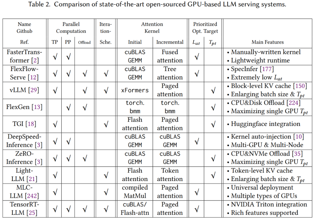 本节研究 LLM 推理系统优化技术,以加速 LLM 推理,而不改变 LLM 计算语义。这一工作的目标是通过改进用于大型语言模型推理的底层系统和框架来提高系统效率,包括低比特量化、并行计算、内存管理、请求调度、和内核优化 等等,详细内容可以参见论文原文。