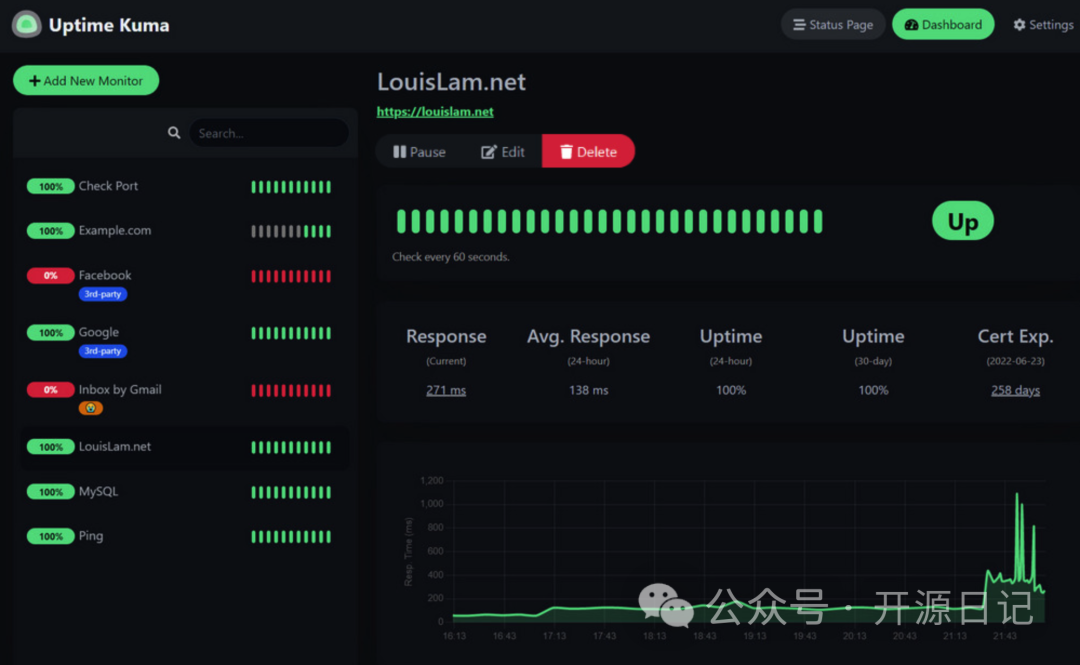 今天要介绍一款界面炫酷的监控带报警功能的软件,可以用于监测各种服务的可用性和状态。它可以通过HTTP(s)、TCP、HTTP(s)关键字、HTTP(s) JSON查询、Ping、DNS记录、推送、Steam游戏服务器和Docker容器等方式进行监测。