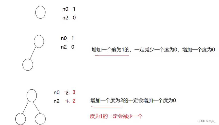 这里分析第3个,其余在前几篇博客已说明。(n0表示度为0,n2表示度为2) 分析:第3个的意思是,度为0的节点的个数是度为2的节点个数+1。 当只有一个节点时,n0为1个,n2为0个。增加一个节点,减少一个n0,增加一个n0,所以n0不变。再如下图所示,再增加一个节点,n2就变为1个,n0也会增加1个,但是n1就会减少。因此有关系:n0=n2+1.