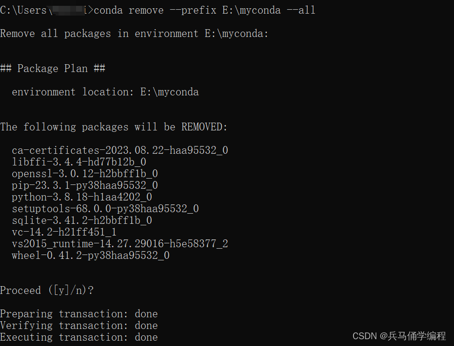 列如:conda remove --prefix E:\myconda --all