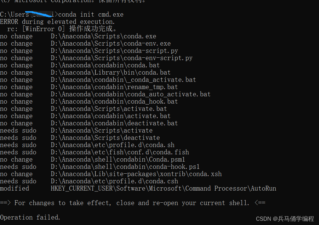 初始化一下,没初始化也不要紧;命令:conda init cmd.exe;完了后,在退出终端重新进一次;