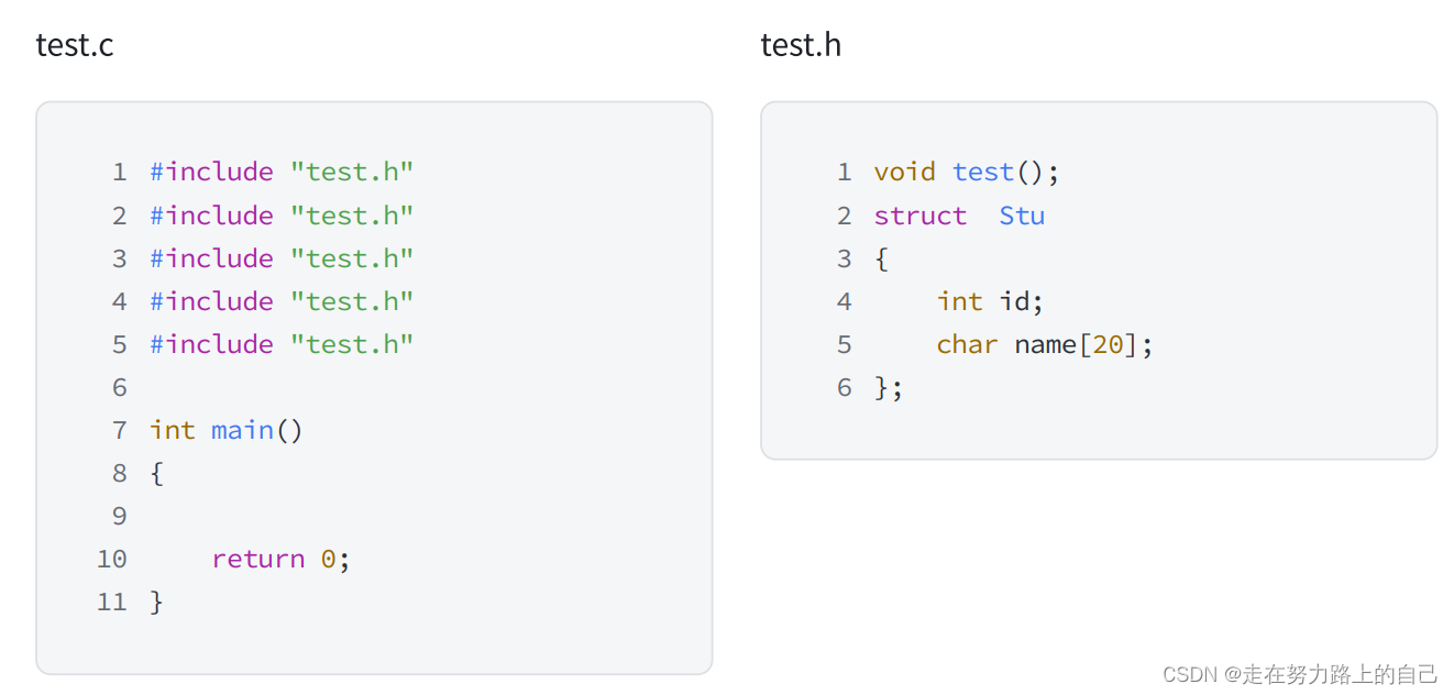 如果直接这样写,test.c文件中将test.h包含5次,那么test.h文件的内容将会被拷贝5份在test.c中。 如果test.h 文件比较大,这样预处理后代码量会剧增。如果工程比较大,有公共使用的头文件,被大家都能使用,又不做任何的处理,那么后果真的不堪设想。 如何解决头文件被重复引入的问题?答案:条件编译。 每个头文件的开头写: