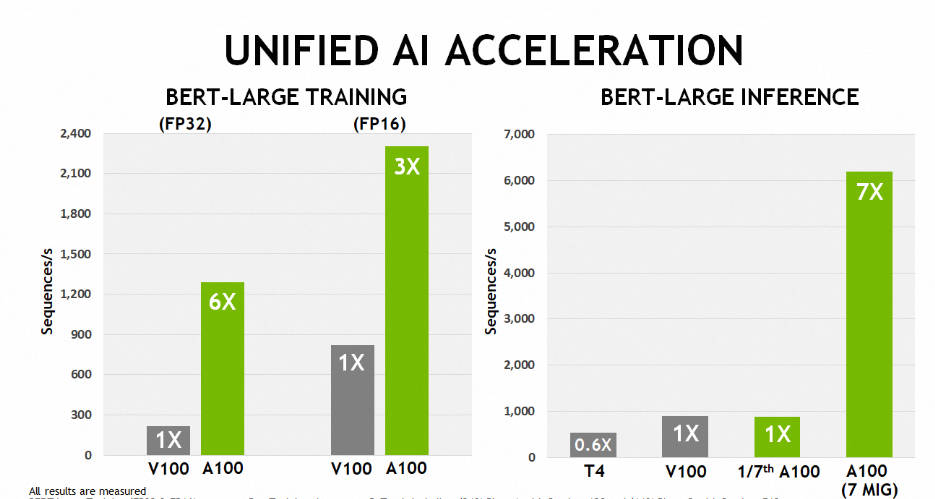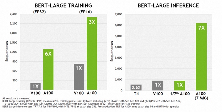 在跑 AI 模型时,如果用 PyTorch 框架,相比上一代 V100 芯片,A100 在 BERT 模型的训练上性能提升 6 倍,BERT 推断时性能提升 7 倍。