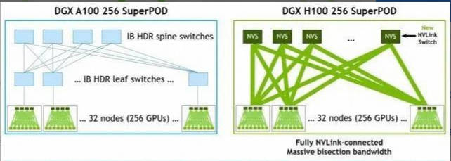 新的 NVLink 互连和基于第三代 NVSwitch 技术的新的二级 NVLink Switches 引入了地址空间隔离和保护,使多达 32 个节点或 256 个 GPU 能够通过 NVLink 以 2:1 的锥形树状拓扑连接起来。