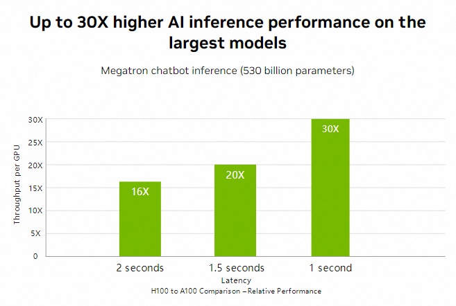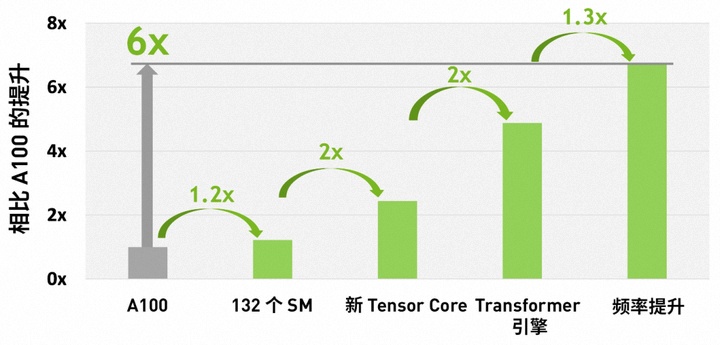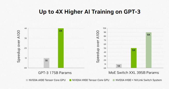 相比 A100,FP8 计算速度提升六倍,达到 4petaflops。内存增加 50%,使用 HBM3 高带宽内存,带宽可达 3 Tbps,外部连接速度几乎达到 5 Tbps。此外,新的 Transformer 引擎使模型转换器训练速度提升高达六倍。