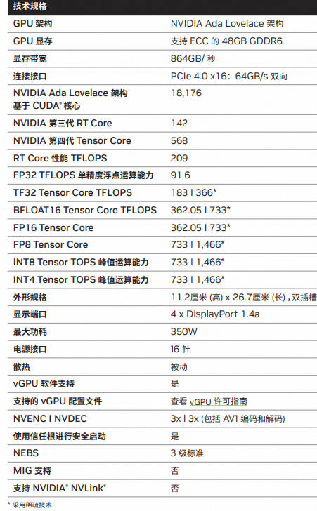 互联技术 | NVLink: 600 GB/s PCIe Gen4: 64 GB/s | NVLink: 900GB/s PCIe Gen5: 128GB/s | PCIe Gen4 x16: 64GB/s bidirectional | NVIDIA NVLink®: 900GB/s PCIe Gen5: 128GB/s | |