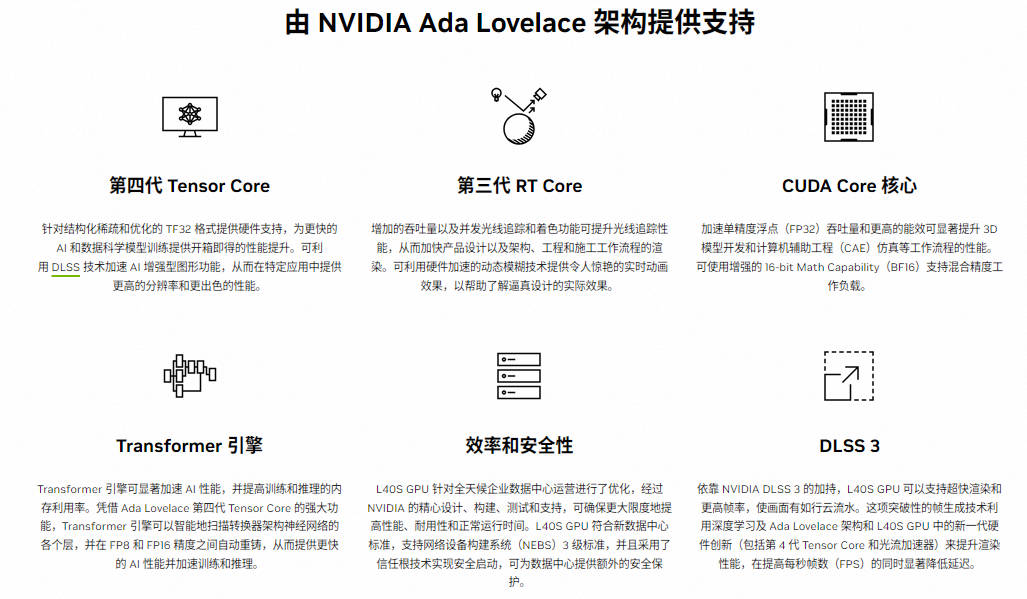 L40S 旨在处理下一代数据中心工作负载,包括生成式 AI、大型语言模型(LLM)的推理和训练,3D 图形渲染、科学模拟等场景。与前一代 GPU(如 A100 和 H100)相比,L40S 在推理性能上提高了高达 5 倍,在实时光线追踪(RT)性能上提高了 2 倍。内存方面,它配备 48GB 的 GDDR6 内存,还加入了对 ECC 的支持,在高性能计算环境中维护数据完整性还是很重要的。L40S 配备超过 18,000 个 CUDA 核心,这些并行处理器是处理复杂计算任务的关键。L40S 更注重可视化方面的编解码能力,而 H100 则更专注于解码。尽管 H100 的速度更快,但价格也更高。从市场情况来看,L40S 相对更容易获得。综上所述,L40S 在处理复杂和高性能的计算任务方面具有显著优势,特别是在生成式 AI 和大型语言模型训练等领域。其高效的推理性能和实时光线追踪能力使其成为数据中心不可忽视的存在。