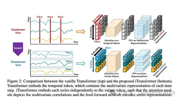 《Inverted Transformers》是2024年发表的一篇论文。这也是目前时间序列预测数据集上的SOTA。基本上,Inverted Transformers采用时间序列的Transformers架构并进行了翻转。整个时间序列序列用于创建令牌。然后,时间序列彼此独立进行嵌入表示。注意力对多个时间序列嵌入进行操作。它有点类似于Crossformer,但它的不同之处在于,它遵循标准Transformers架构。