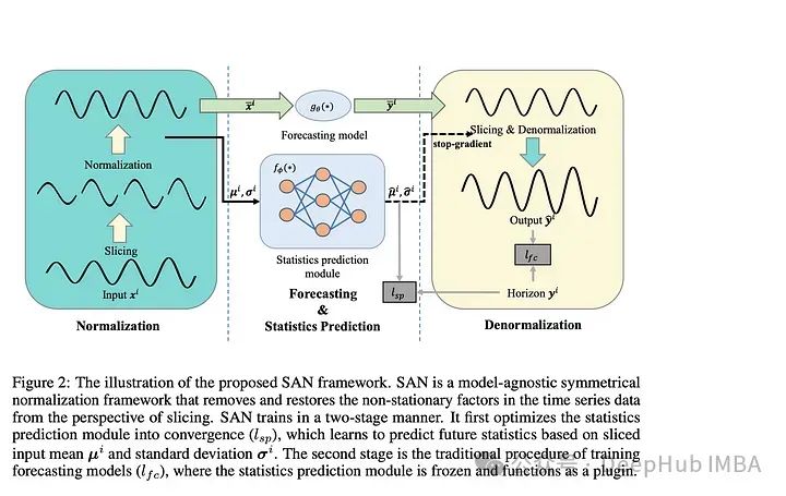 论文介绍了一种“模型不可知的归一化框架”来简化非平稳时间序列数据的预测。作者让SAN分两步操作:训练一个统计预测模型(通常是ARIMA),然后训练实际的深度时间序列基础模型(使用统计模型对TS数据进行切片、归一化和反归一化)。统计模型对输入时间序列进行切片,以便学习更健壮的时间序列表示并去除非平稳属性。作者指出:“通过对切片级特性进行建模,SAN能够消除局部区域的非平稳性。”SAN还显式地预测目标窗口的统计信息(标准差/平均值)。这使得它在处理非平稳数据时,与普通模型相比,能够更好地适应随时间的变化。