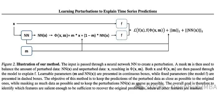 大多数用于深度学习解释的扰动技术都是面向静态数据(图像和文本)的。但是对于时间序列特别是多元TS需要更大范围的扰动来学习随机影响。作者提出了一种基于深度学习的方法,可以学习数据的掩码和相关的扰动,更好地解释特征的重要性。然后将掩码和扰动的输入传递给模型,并将输出与未扰动数据的输出进行比较。据两个输出之间的差值计算损失。