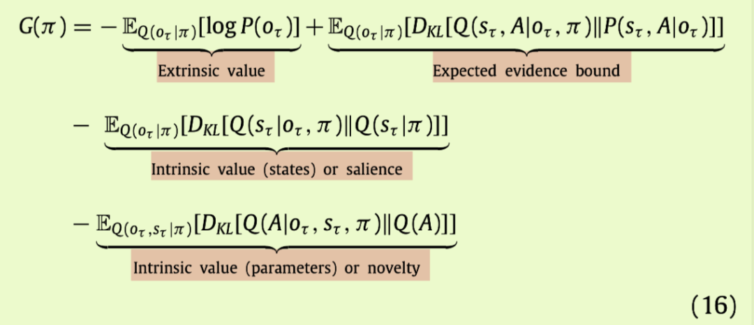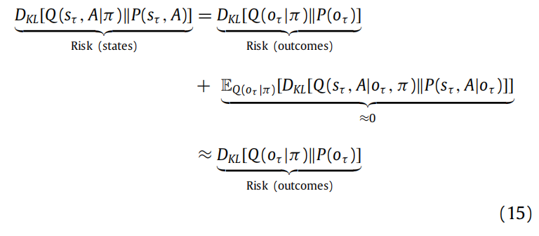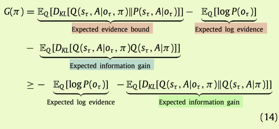 在公式(14)中,第一项是在对未来结果的信念下的对数证据的期望值,而第二项确保在遇到结果时这种期望是最充分的。总的来说,这两项支持解决关于隐藏状态(即信息增益)和结果(即期望意外)的不确定性,与先验信念相关。