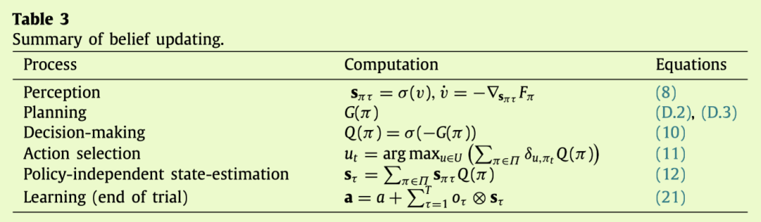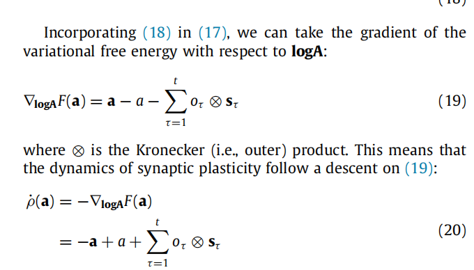 随后,先验信念P(A)被更新为下一次试验的近似后验信念Q(A)。特别要注意的是,更新计算了特定状态和观察之间的映射被观察到的次数。有趣的是,这在形式上与联想或Hebbian可塑性完全相同。After which, the prior beliefs P(A) are updated to the approximate posterior beliefs Q (A) for the subsequent trial. Note that in particular, the update counts the number of times a specific mapping between states and observations has been observed.Interestingly, this is formally identical to associative or Hebbian plasticity.