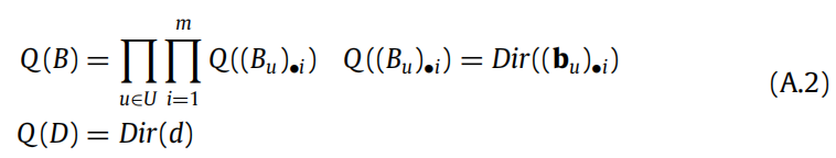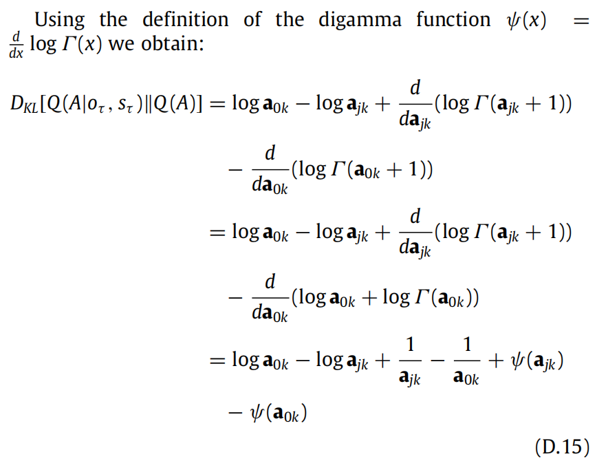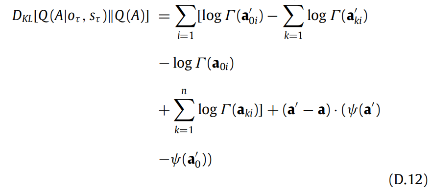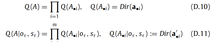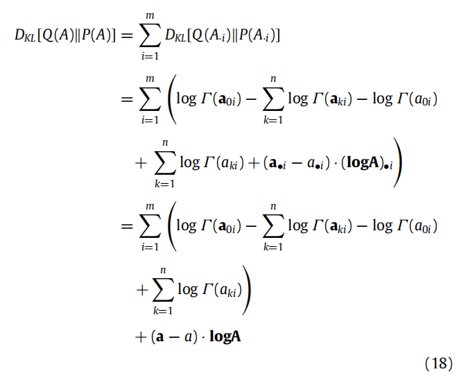 在这里,我们忽略了(5)中不依赖于Q(A)的项,因为当我们取梯度时,这些项将消失。Dirichlet分布之间的KL散度是(Kurt, 2013; Penny, 2001):