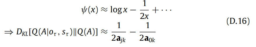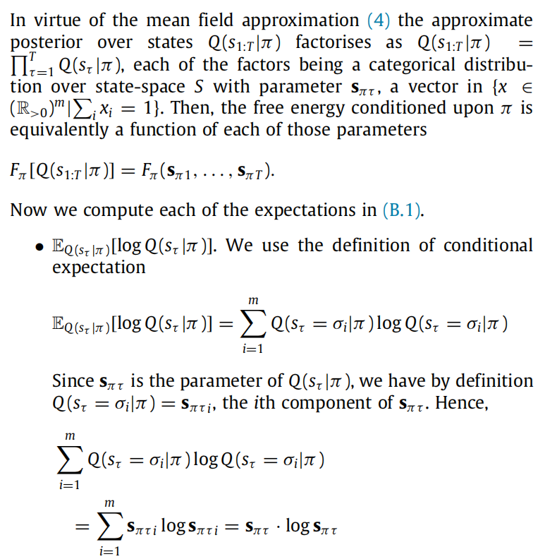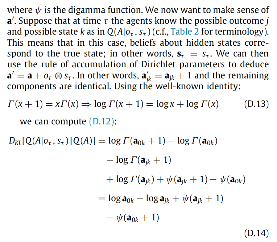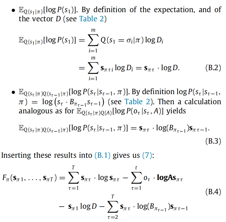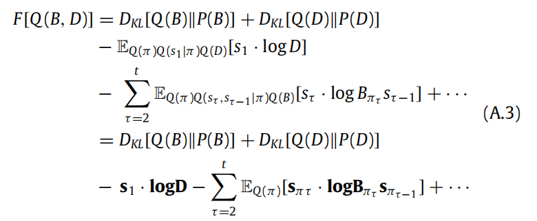 ,之后,变分自由能的计算方式类似于方程(5)中的方法。然后,找到信念动态的过程类似于第8节 - 我们在下面重复说明:选取只依赖于 B 和 D 的变分自由能项。