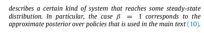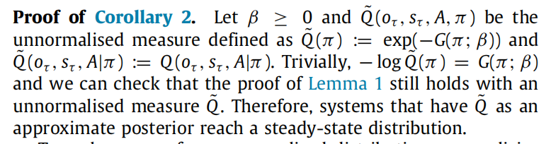 我们将推迟 Corollary 2 的证明到本附录的最后。分布族Q(π; β) h具有有趣的解释。例如,当β = 0 时对应于标准的随机控制,也称为 KL 控制或风险敏感控制(van den Broek 等,2010年):