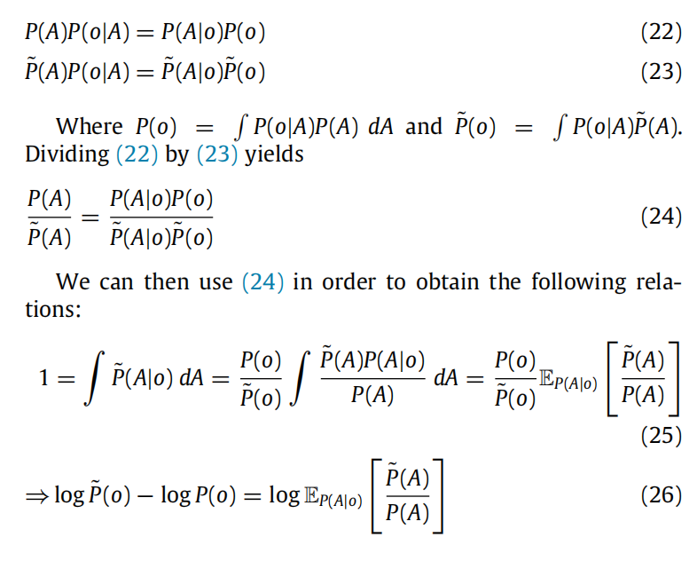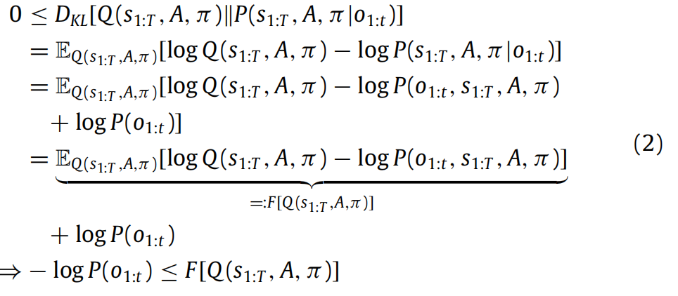 上的 Kullback–Leibler(KL)散度(Kullback&Leibler,1951)DKL一个非负的概率分布之间差异的度量。我们可以使用 KL 散度的定义和贝叶斯规则来得到变分自由能 F,它是近似后验信念的泛函: