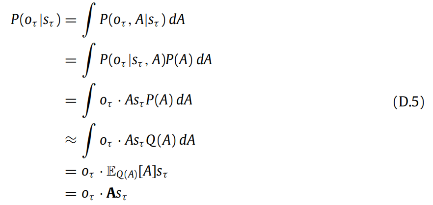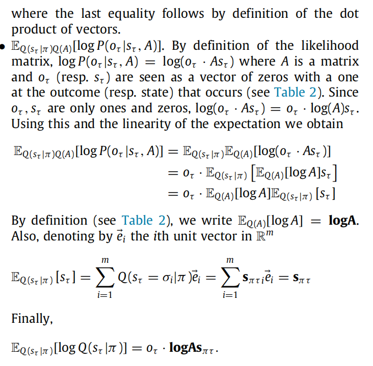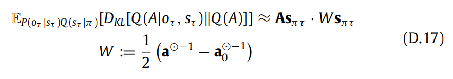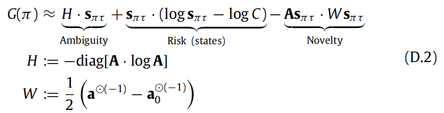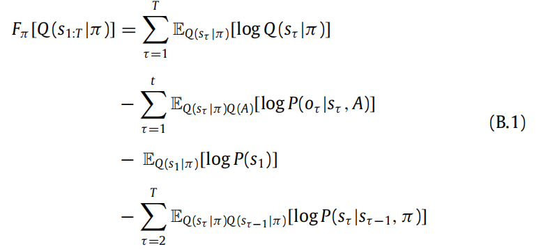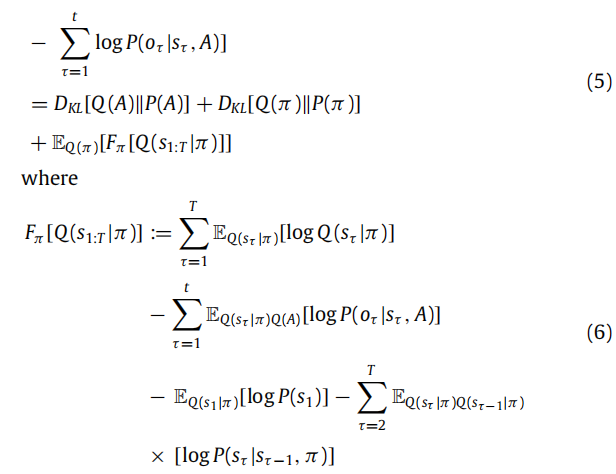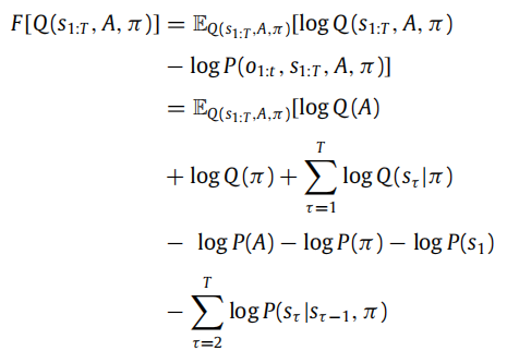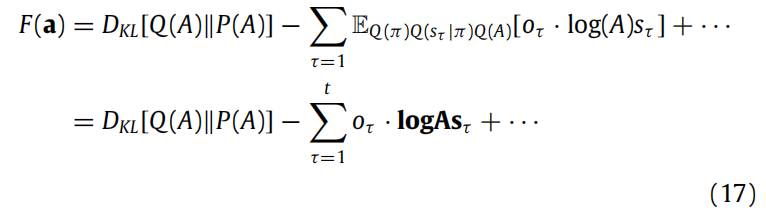 这里,Q(A|oτ , sτ ) 表示关于A的近似后验信念,如果我们知道状态-结果对(oτ , sτ ).的发生。接下来,我们将展示我们可以通过以下方式计算预期自由能:
