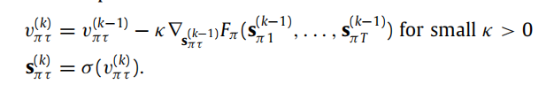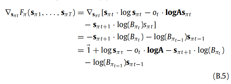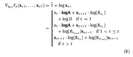 现在我们可以计算Fπ关于其任意参数sπ1, . . . , sπT . 的梯度。我们以sπt, t > 1,为例进行说明,其他情况类似。当计算梯度∇sπt Fπ ,在(B.4)中唯一不消失的项是那些依赖于 sπt 的项。利用矩阵和向量的微分规则(Petersen & Pedersen, 2012),我们得到(8)。