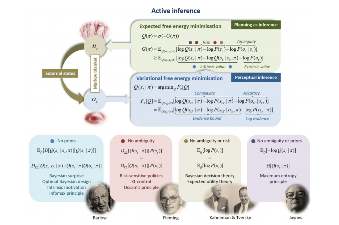 为了在不断变化的环境中生存,生物(和人工)代理必须将它们的感知保持在某种适宜范围内(即通过异稳态维持稳态)。简而言之,主动推理提出,代理通过优化两个互补的客观函数来实现这一点,即变分自由能和期望自由能。简而言之,前者衡量了其感知的内部(生成)模型与感官观察之间的契合程度,而后者根据其能够达到“首选”存在状态的能力评分每个可能的行动路线。