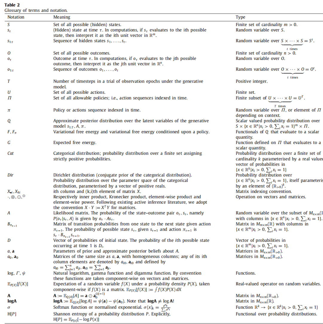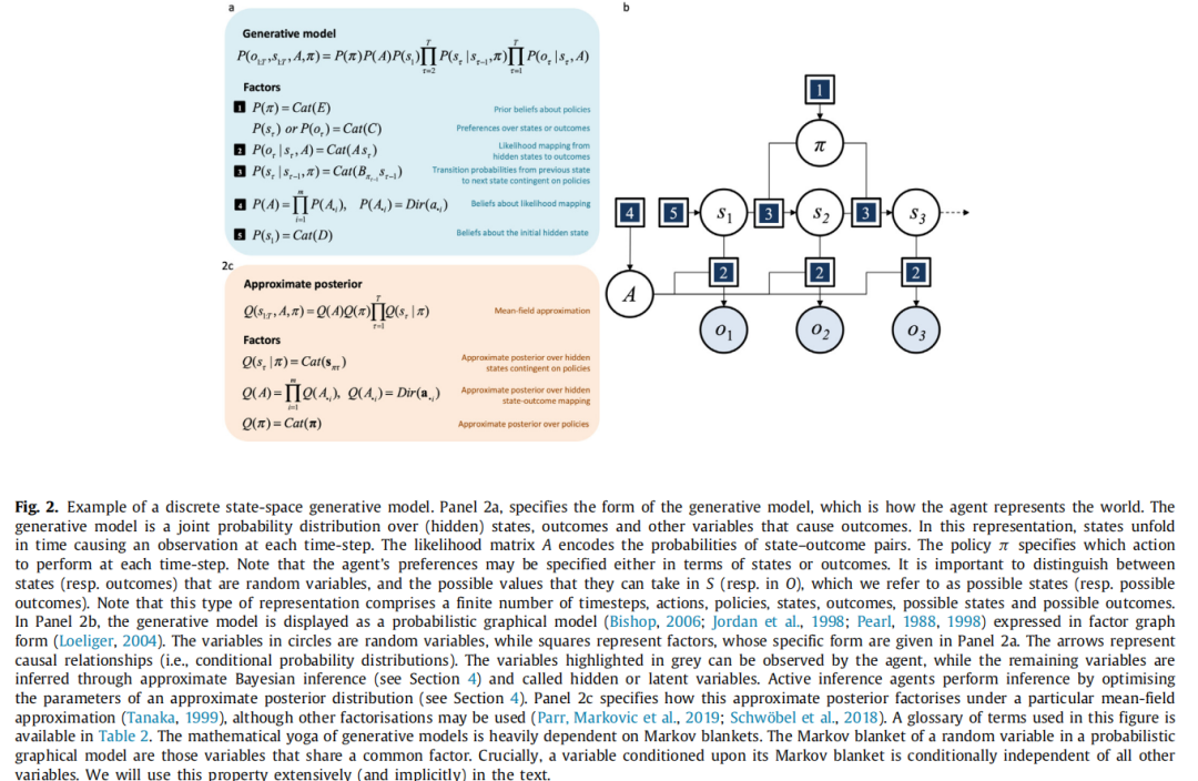 图2. 离散状态空间生成模型示例。面板2a指定了生成模型的形式,即代理如何表示世界。生成模型是关于(隐藏)状态、结果以及导致结果的其他变量的联合概率分布。在这种表示中,状态随时间展开,在每个时间步骤引发一个观察结果。似然矩阵 A 编码了状态-结果对的概率。策略 π 指定了每个时间步骤应执行的动作。请注意,代理的偏好可以根据状态或结果来指定。重要的是要区分随机变量的状态(或结果),以及它们可以在 S(或 O)中取的可能值,我们将其称为可能状态(或可能结果)。请注意,这种表示包括有限数量的时间步骤、动作、策略、状态、结果、可能状态和可能结果。在面板2b中,生成模型以概率图模型(Bishop,2006;Jordan 等,1998;Pearl,1988,1998)的因子图形式显示(Loeliger,2004)。圆圈中的变量是随机变量,而方块表示因子,其具体形式见面板2a。箭头表示因果关系(即条件概率分布)。灰色突出显示的变量可以被代理观察到,而其余变量通过近似贝叶斯推断进行推断(请参见第4节),称为隐藏或潜在变量。主动推断代理通过优化近似后验分布的参数来执行推断(请参见第4节)。面板2c指定了在特定均场近似(Tanaka,1999)下,此近似后验是如何分解的,尽管也可以使用其他分解方法(Parr,Markovic 等,2019;Schwöbel 等,2018)。本图使用的术语表可在表2中找到。生成模型的数学构造严重依赖于马尔科夫毯。在概率图模型中,随机变量的马尔科夫毯是与之共享公共因子的变量。关键是,条件于其马尔科夫毯的变量在条件下独立于所有其他变量。我们将在文本中广泛(并隐含地)使用此属性。