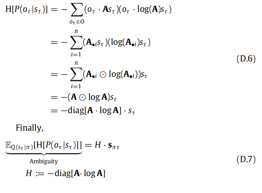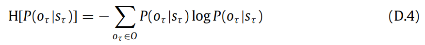 (D.1)中的歧义项是EQ(sτ |π)[H[P(oτ |sτ )]].根据定义,期望中的熵是: