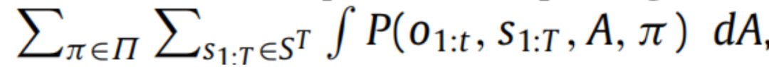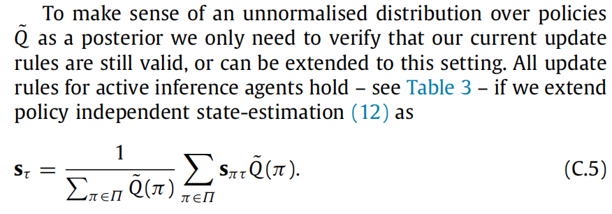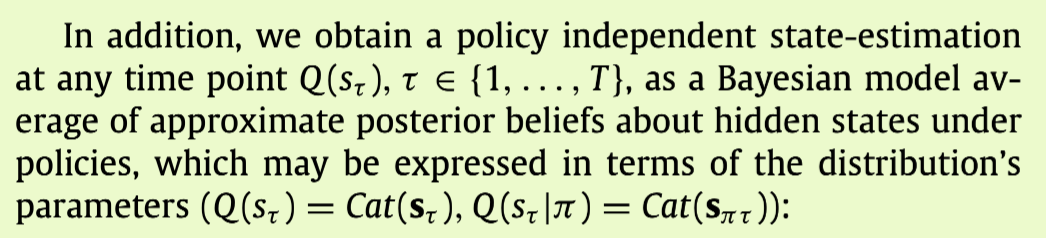 此外,在任何时间点Q(sτ ), τ ∈ {1, . . . , T },我们还可以获得独立于策略的状态估计 Q(sτ),作为对隐藏状态的近似后验信念的贝叶斯模型平均,这可以用分布的参数表示(Q(sτ ) = Cat(sτ ), Q(sτ |π) = Cat(sπτ )):