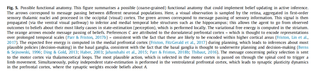 在本文中,我们考虑了一种简单的先验近似策略;即, σ(−G(π))。这可以扩展为 σ(−γ G(π)),其中γ是一个(逆)温度参数,表示选择特定策略的信心程度。从某种意义上说,这种扩展是很自然的,因为γ可以被解释为多巴胺输入的postsynaptic响应(FitzGerald, Dolan等人,2015;Friston等人,2014)。这种对应关系得到了经验证据的支持(Schwartenbeck,FitzGerald,Mathys,Dolan和Friston,2015),并使得能够模拟生物学上合理的多巴胺放电(参见附录E(Friston,FitzGerald等人,2017))。在解剖学上,这个参数可能被编码在黑质内,在黑质-纹状体多巴胺投射神经元中(Schwartenbeck,FitzGerald,Mathys,Dolan和Friston,2015),这与我们提出的功能解剖学相吻合(参见图5),因为黑质与纹状体相连。我们建议读者参考(Friston, FitzGerald等人,2017)以讨论相关的信念更新方案。
