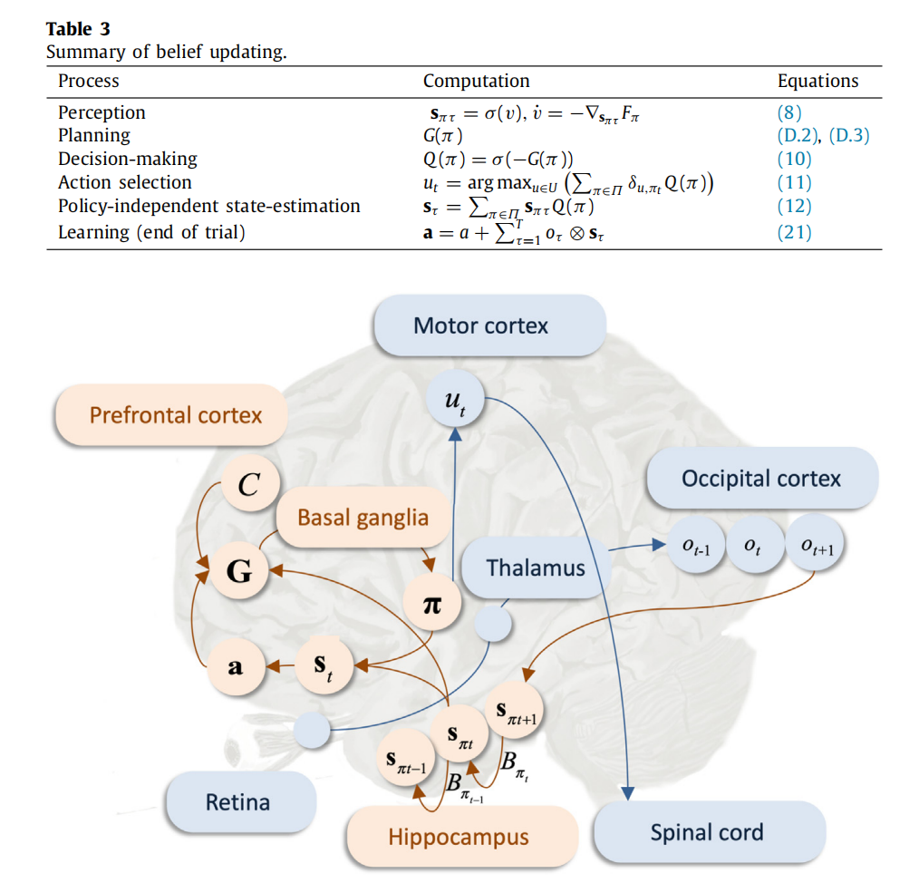 在这里,风险指的是未来预测与先验预测之间的差异(例如,金融风险中的损失量化),而模糊性则是与未来观察相关的不确定性,考虑到当前状态。这意味着最可能(即最佳)的策略将最小化期望自由能。这确保了未来的行动方案既具有开发性(即最小化风险),又具有探索性(即最小化模糊性)。特别地,期望自由能平衡着追求目标和追求新奇行为之间的关系,考虑了一些先验偏好或目标。请注意,模糊性术语基于对未来状态的信念下虚构(即预测)结果的期望。这意味着在感知过程中优化对未来状态的信念对于准确预测规划过程中的未来结果至关重要。总之,规划和决策分别对应于评估不同策略的期望自由能,该自由能评估了它们相对于先前偏好的优劣,并形成了关于策略的近似后验信念。