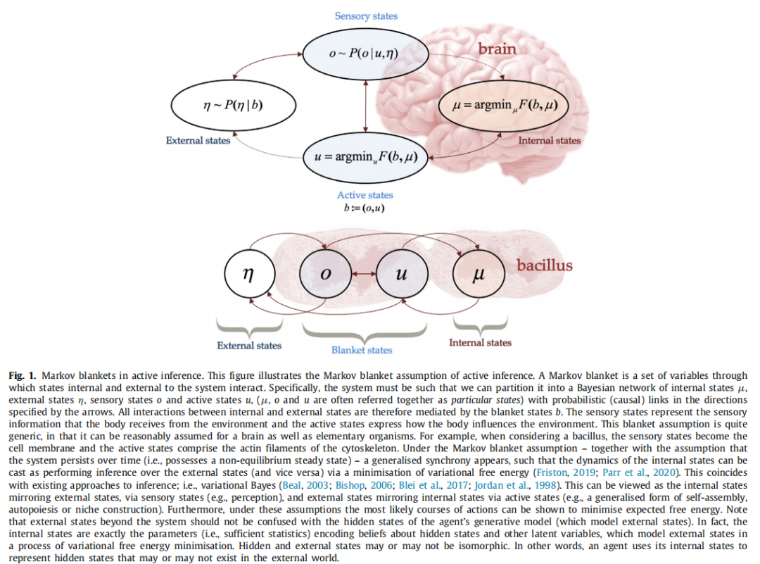 图1. 主动推理中的马尔可夫毯子。本图展示了主动推理中的马尔可夫毯子假设。马尔可夫毯子是通过它们之间的一组变量进行内部和外部状态交互的集合。具体来说,系统必须被分成一个贝叶斯网络,其中包括内部状态μ、外部状态η、感官状态o和主动状态u,(μ、o和u通常一起称为特定状态),并且具有由箭头指定方向的概率(因果)链接。因此,所有内部和外部状态之间的交互都由毯子状态b介导。感官状态代表身体从环境中接收到的感官信息,而主动状态表示身体如何影响环境。这种毯子假设非常通用,因为它可以合理地假设适用于大脑以及初级生物体。例如,当考虑一个杆菌时,感官状态成为细胞膜,而主动状态包括细胞骨架的肌动蛋白丝。在马尔可夫毯子假设下 - 与系统随时间持续存在(即具有非平衡稳定状态)的假设一起 - 出现了一种广义的同步性,使得内部状态的动态可以被视为通过最小化变分自由能对外部状态进行推断(反之亦然)(Friston, 2019; Parr et al., 2020)。这与现有的推理方法相吻合;即,变分贝叶斯(Beal, 2003; Bishop, 2006; Blei et al., 2017; Jordan et al., 1998)。这可以被视为内部状态通过感官状态(例如,感知)反映外部状态,以及外部状态通过主动状态(例如,自我组装、自组织或环境构建的广义形式)反映内部状态。此外,在这些假设下,最可能的行动路线可以被证明是最小化期望自由能。请注意,系统之外的外部状态不应与代理的生成模型的隐藏状态(模拟外部状态的模型)混淆。实际上,内部状态恰好是编码对隐藏状态和其他潜在变量的信念的参数(即,足够的统计量),它们在变分自由能最小化过程中模拟外部状态。隐藏状态和外部状态可能是同构的,也可能不是。换句话说,代理使用其内部状态来表示可能存在也可能不存在于外部世界中的隐藏状态。