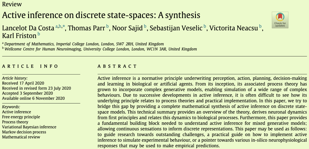 由于主动推理在最近的理论进步速度很快,因此往往很难保持对其过程理论和实际实现的全面了解。在本文中,我们希望提供主动推理在离散状态空间模型上的全面(数学)综述。这一技术摘要提供了理论的概述,从第一原理中推导出相关(神经)动态,并将其与已知的生物过程联系起来。此外,本文和Buckley等人(2017)提供了理解混合生成模型上主动推理所需的基本组件。本文可被视为实施主动推理以模拟实验行为的实用指南,或者是指向各种可在体外神经和电生理反应中进行实证测试的方向。
