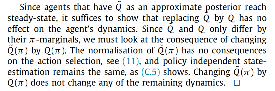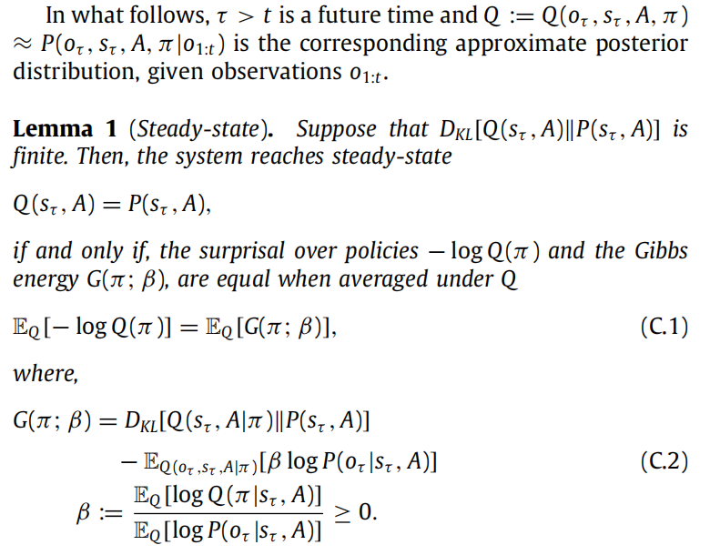 本附录的目的是从达到稳态的角度来解释预期自由能的定义。具体地,我们将展示一个分布族 Q(π),其中包括(负的softmax)预期自由能,可以保证达到稳态。