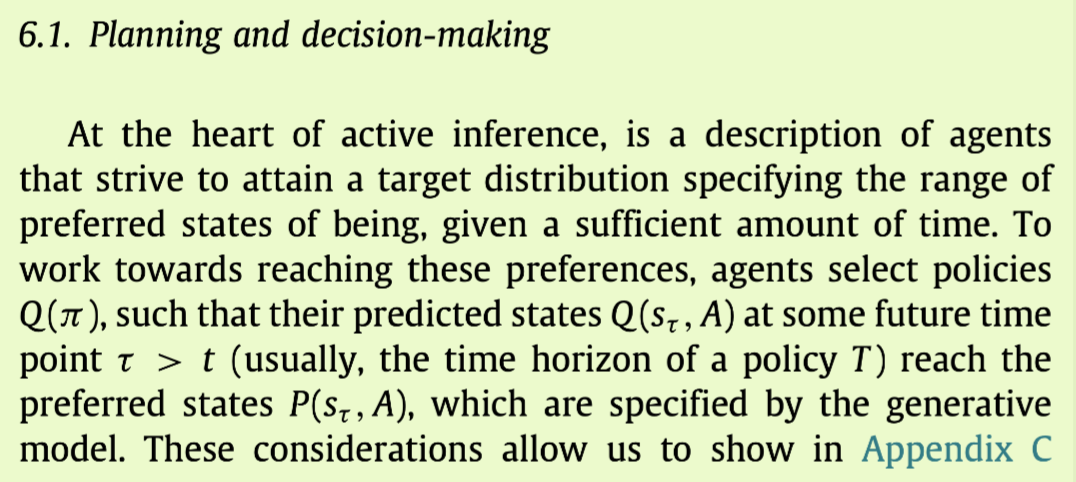 在主动推理的核心是对代理人的描述,他们努力实现目标分布,该分布指定了在足够长的时间内所偏好的存在状态的范围。为了朝着达到这些偏好的目标努力,代理人选择策略Q(π),使得它们在未来某个时间点τ > t(通常是策略T的时间范围)的预测状态Q(sτ , A) 达到由生成模型指定的优选状态P(sτ , A),这些考虑使我们能够在附录C中展示,策略Q(π的必要近似后验是负期望自由能G“4”注释:更完整的处理可能包括政策的先验(通常用 E 表示)以及观察到的结果提供的政策证据(通常用 F 表示)。这些附加项补充了预期的自由能,导致近似后验形式为 σ(− log E−F−G)(Friston 等人,2018b)的softmax函数。