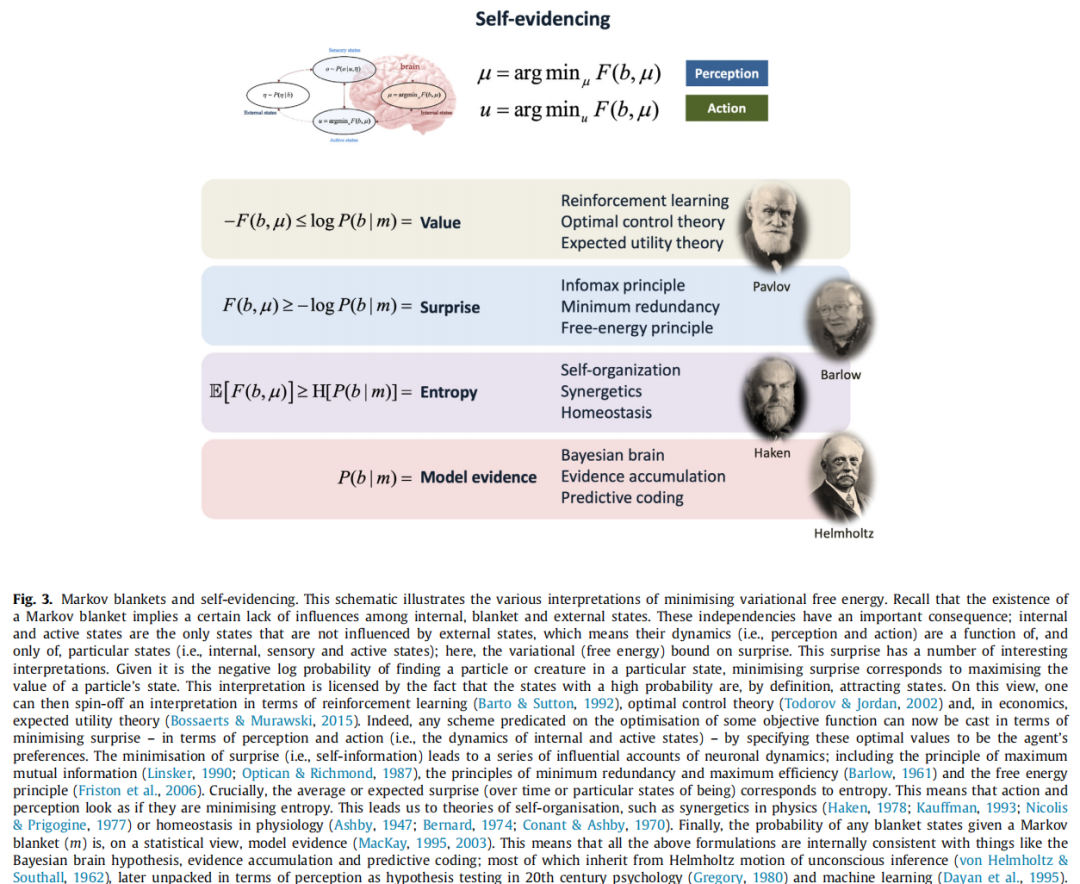 图3. 马尔可夫毯和自我证实。本示意图说明了最小化变分自由能的各种解释。回想一下,马尔可夫毯的存在意味着内部、毯子和外部状态之间缺乏一定的影响。这些独立性具有重要的后果;内部和活动状态是唯一不受外部状态影响的状态,这意味着它们的动态(即感知和行动)是特定状态(即内部、感官和活动状态)的函数,即这里的变分(自由能)约束的惊讶。这种惊讶有许多有趣的解释。考虑到它是找到一个粒子或生物在特定状态下的负对数概率,最小化惊讶相当于最大化粒子状态的价值。这种解释是合理的,因为高概率状态是吸引状态的定义。在这个观点下,可以将其解释为强化学习(Barto&Sutton,1992)、最优控制理论(Todorov&Jordan,2002)以及经济学中的预期效用理论(Bossaerts&Murawski,2015)。实际上,任何基于优化某个目标函数的方案现在都可以用最小化惊讶的术语来表达 - 以感知和行动的方式(即内部和活动状态的动态) - 通过指定这些最优值为代理的偏好。最小化惊讶(即自信息)导致了一系列有影响力的神经动态描述;包括最大互信息原理(Linsker,1990;Optican&Richmond,1987)、最小冗余和最大效率原理(Barlow,1961)以及自由能原理(Friston等,2006)。关键是,平均或预期的惊讶(随时间或特定状态的存在)对应于熵。这意味着行动和感知看起来就像在最小化熵。这使我们得出了自组织理论,例如物理学中的协同理论(Haken,1978;Kauffman,1993;Nicolis&Prigogine,1977)或生理学中的稳态理论(Ashby,1947;Bernard,1974;Conant&Ashby,1970)。最后,从统计观点来看,马尔可夫毯给定马尔可夫毯(m)的任何毯子状态的概率是模型证据(MacKay,1995,2003)。这意味着所有上述的制定都与贝叶斯大脑假设、证据积累和预测编码等内部一致;其中大部分继承自赫尔姆霍兹的无意识推断运动(von Helmholtz&Southall,1962),后来在20世纪心理学(Gregory,1980)和机器学习(Dayan等,1995)中以假设测试的形式加以阐述。