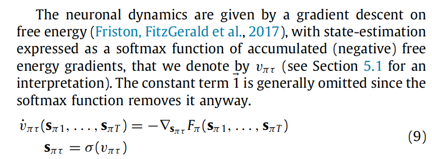 正如神经动态涉及从突触后电位到发放率的转换一样,(9)涉及从一组实数(v)到其元素介于零和一之间的向量(sπτ)的转换;通过softmax函数。因此,自然地将v的分量解释为不同神经群体的平均膜电位,将sπτ解释为这些群体的平均发放率,这要归功于神经的不应期。这与神经群体动态的平均场表述一致,即神经群体的平均发放率遵循平均膜电位的sigmoid函数(Deco等人,2008;Marreiros等人,2008;Moran等人,2013)。利用softmax函数是对向量输入的sigmoid函数的一种推广的事实-这里是耦合神经群体的平均膜电位-可以得出他们的平均发放率遵循他们的平均电位的softmax函数。在这种情况下,softmax函数可以被解释为执行侧抑制,这可以被认为导致个体神经元的调谐曲线更窄,从而进行更尖锐的推断(Von Békésy,1967)。重要的是,这告诉我们状态估计可以由不同的神经群体并行执行,并且简单的神经结构足以实现这些动态(参见Parr,Markovic等人(2019年,图6))。