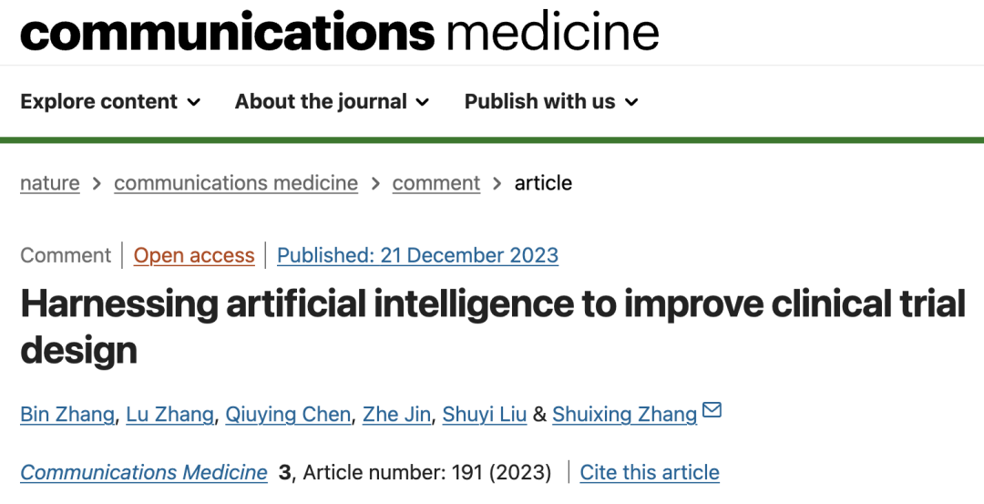 2023年12月21日,来自暨南大学附属第一医院的张水兴课题组在Nature子刊《Communications Medicine》上发表文章Harnessing artificial intelligence to improve clinical trial design,讨论了如何利用人工智能来优化临床试验设计,并提高临床试验的成功率。