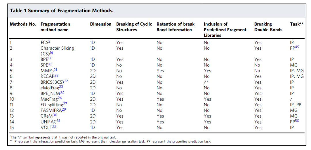 本综述首先总结了15种分子切分方法。从基于现有片段库的方法、基于序列的方法和基于结构的方法的角度介绍了分子切分的逻辑,并提出了潜在的分子切分方法。其次,讨论了分子切分技术的应用。最后,提出了基于具体应用场景的分子片段选择策略。