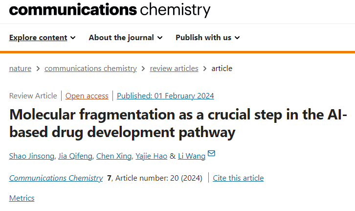 Jinsong, S., Qifeng, J., Xing, C. et al. Molecular fragmentation as a crucial step in the AI-based drug development pathway. Commun Chem 7, 20 (2024). https://doi.org/10.1038/s42004-024-01109-2