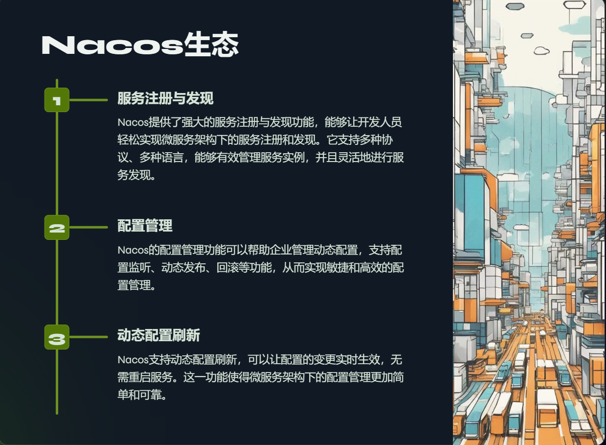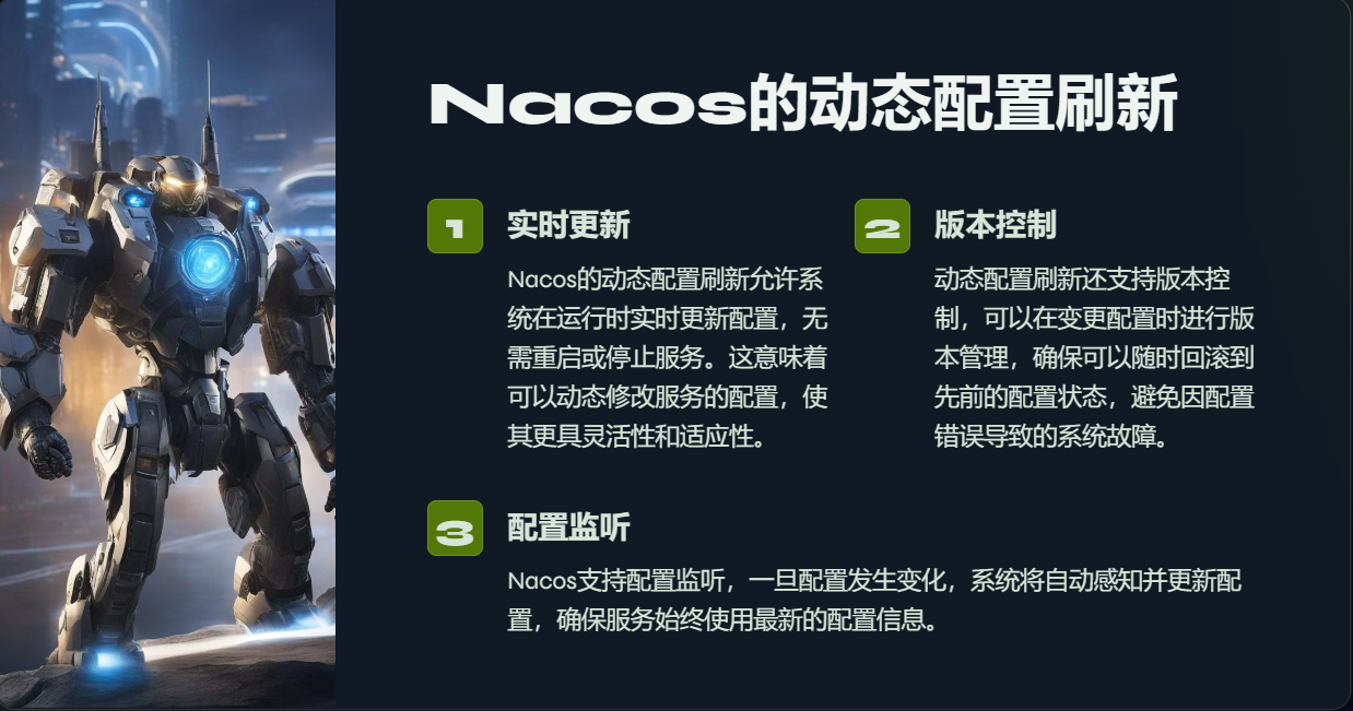 - 动态配置:Nacos允许开发者将配置信息存储在服务器上,客户端可以动态获取和更新配置,而无需重启服务。