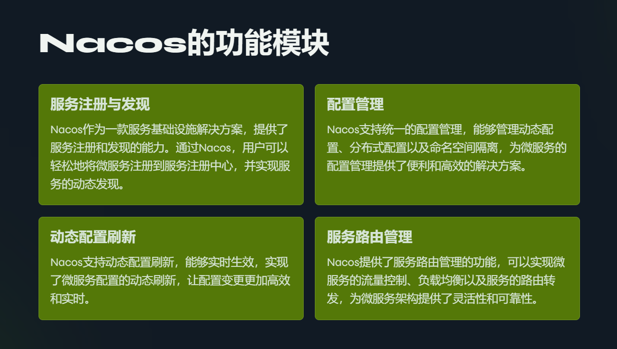 这些核心特性使得Nacos成为一个功能丰富、灵活且可靠的服务发现和配置管理解决方案,适用于构建和管理大规模的分布式系统。