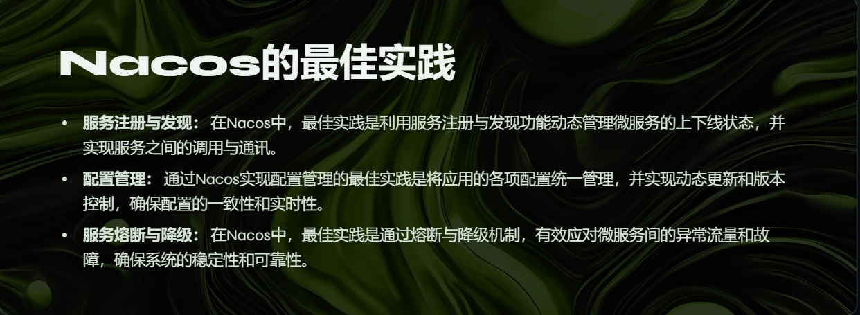 通过这些机制,Nacos能够在服务实例出现问题时自动进行故障转移,确保系统的高可用性和稳定性。同时,Nacos的配置管理功能也支持动态配置的推送,使得服务在恢复后能够快速地重新加载配置信息。
