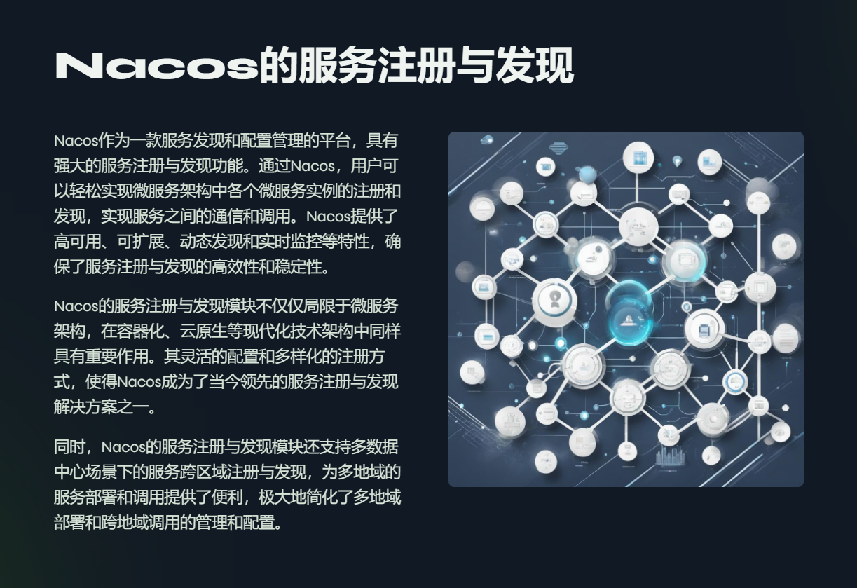 - 动态服务发现:Nacos允许服务实例在启动时向注册中心注册,并在实例下线时自动注销,实现服务的动态发现。
