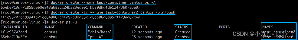 利用镜像创建出一个Created 状态的待启动容器:docker create [OPTIONS] IMAGE [COMMAND] [ARG...]