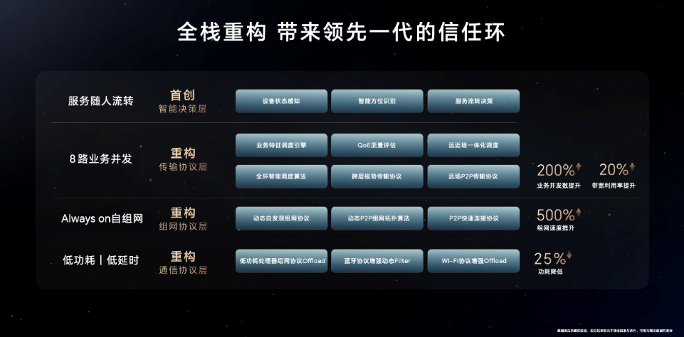 传输协议层也得到重构,带来高并发 / 高吞吐的体验,最大支持 8 业务并发,带宽利用率提升 20%,为用户构筑起以人为中心的智慧互联新体验。