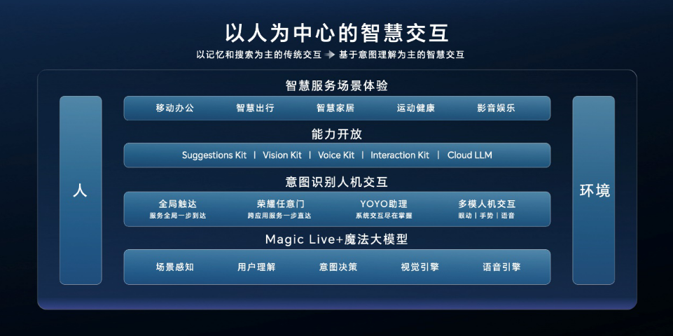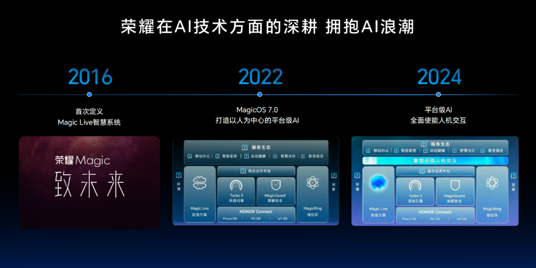 在现场,荣耀终端有限公司产品线总裁方飞表示,荣耀早在 2016 年就开始布局 AI,发布了 Magic Live 智慧系统,2022 年打造以人为中心的 MagicOS 7.0 平台级 AI 能力,再到现如今实现了平台级 AI 全面使能人机交互。