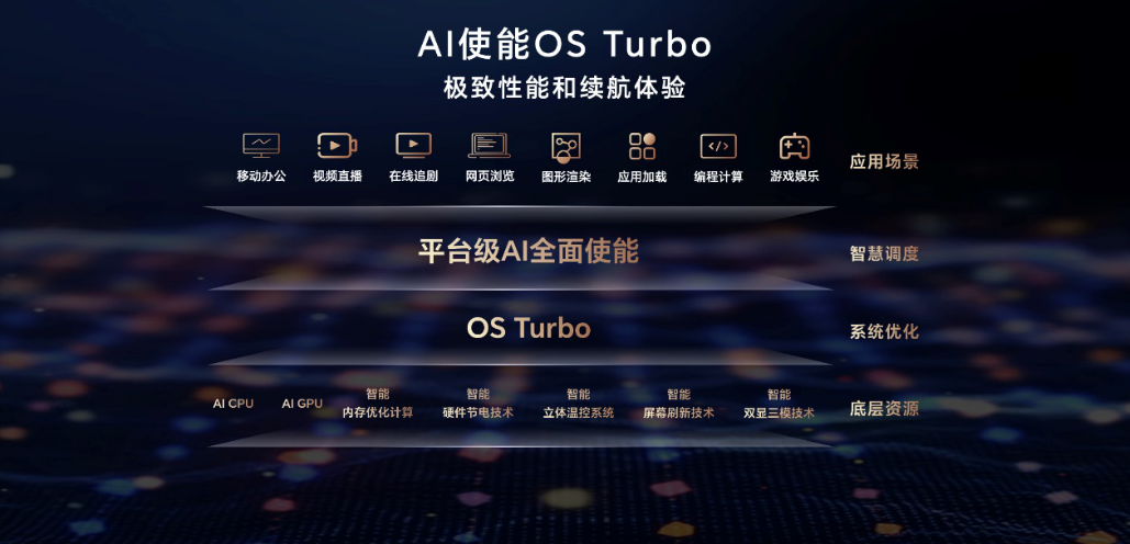 平台级 AI 使能智能硬件,通过轻薄设计、OS Turbo 3.0 以及创新散热系统,充分解决 PC 用户对于续航、性能、便携无法同时满足的核心痛点,从而让消费者无需再做选择题。