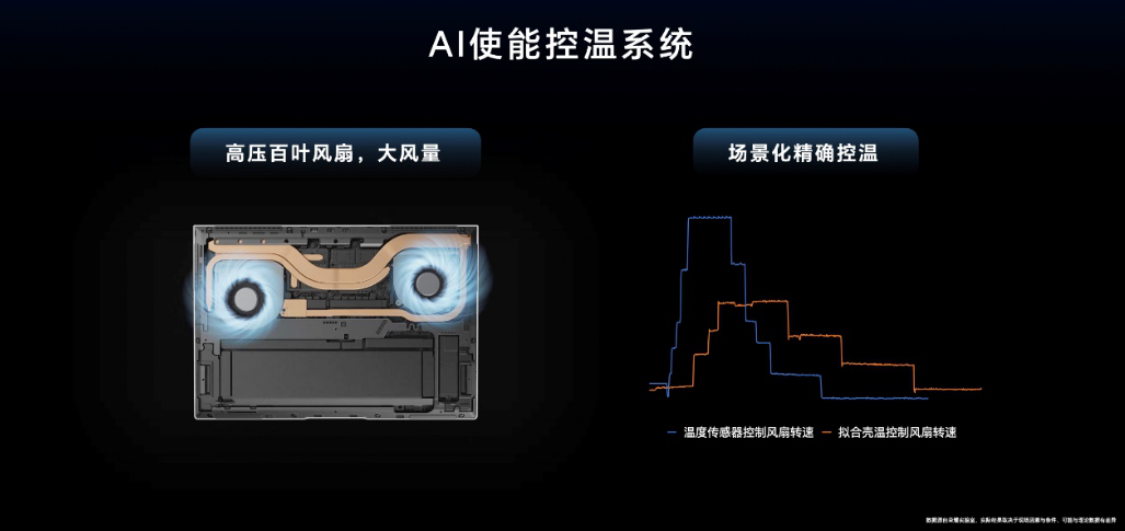 同时,配合 AI 使能的智能控温设计,通过用户场景辨识实现场景化精准温控,提供用户极佳的性能与散热体验。