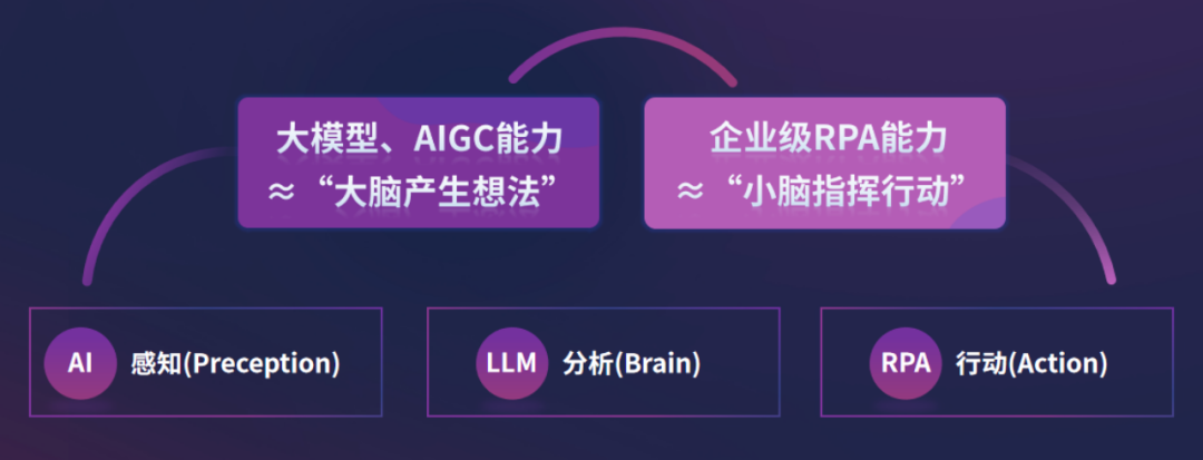 正如一名天才的策略家无法独自赢得战争一样,大模型也需要将其战略和计划转化为行动,而这正是RPA的专长。RPA,是一种以业务流程自动化为优势的技术,它不仅能够无缝执行重复性高的任务,还能够执行大模型生成的复杂指令。将这两种技术结合起来,就像是在智能的大脑上安装了一双灵巧的手,可以将智慧转化为实际的操作。